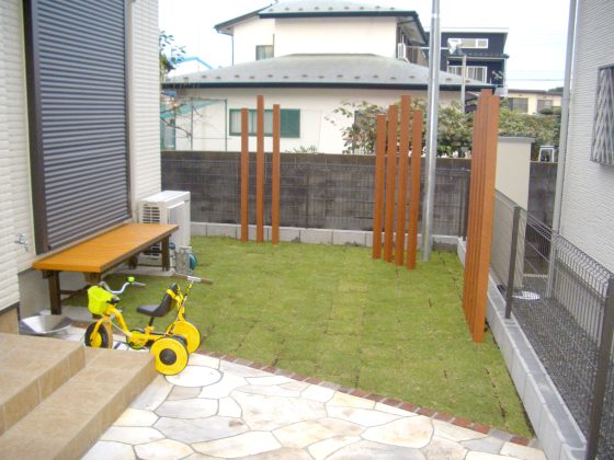 #オープン#ナチュラル #アプローチ#乱形石貼り#レンガライン#塗り門塀#タイル貼り#目隠し#境界塀#メッシュフェンス#庭#枕木材#天然芝#縁台#立水栓#タマリュウライン