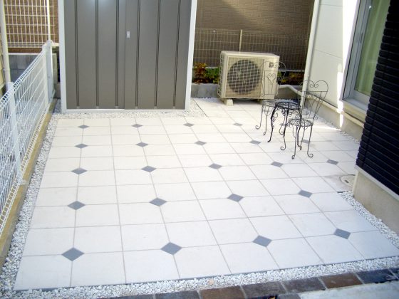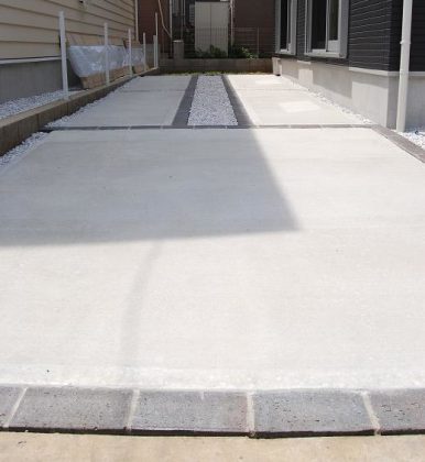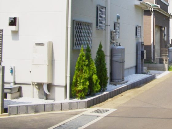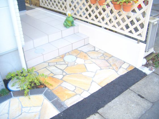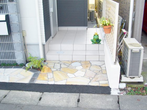 #オープン#モダン #アプローチ#乱形石貼り#レンガライン#化粧ブロック門塀#ガラスブロック#植栽#コニファー#庭#テラス#インターロッキング