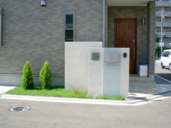 #オープン#ナチュラル #塗り門塀#モザイクタイル貼り#埋込ポスト #乱形石貼り#レンガライン#植栽#コニファー#天然芝#埋込ライト