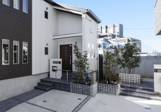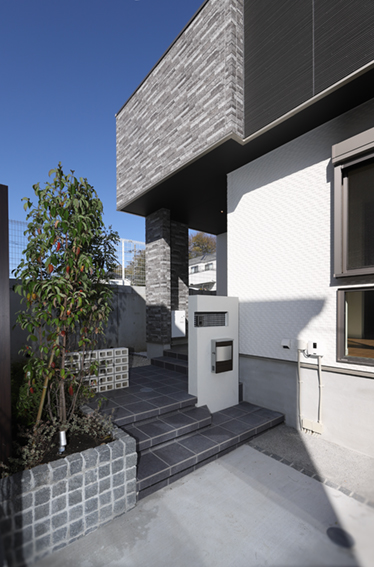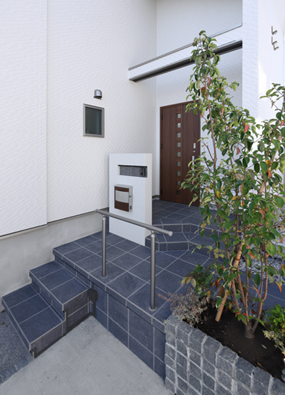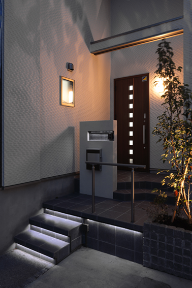 #塗り門塀#壁付ポスト#ラインライト#モザイクタイル貼り#宅配ボックス#角柱 #300角タイル貼り#ピンコロ敷き#化粧砂利#洗い出し#ピンコロライン #メッシュフェンス#ピンコロ積花壇#空洞レンガ #ヤマボウシ#シマトネリコ #スポットライト#ラインライト#階段間接照明