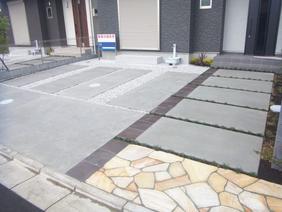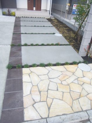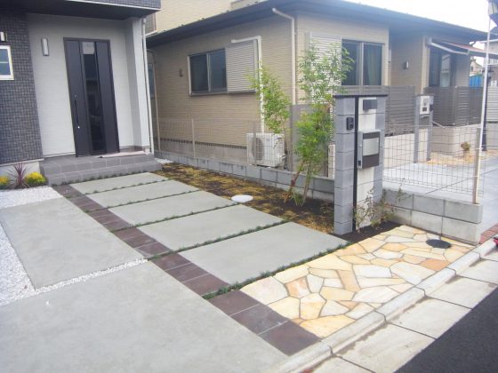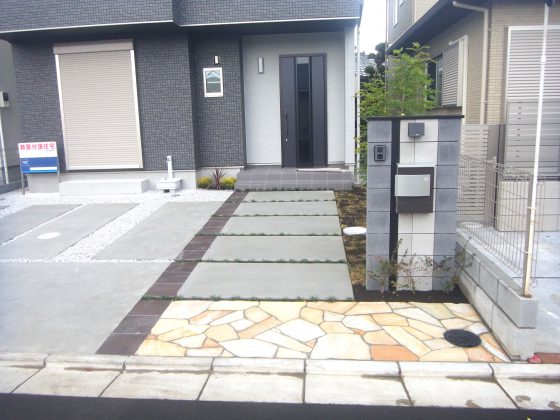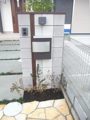 #化粧ブロック門塀#笠木#壁付ポスト #乱形石貼り#300角タイル貼り#レンガライン#砂利ライン#メッシュフェンス #植栽#タマリュウ#コルジリネ