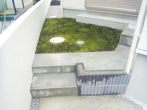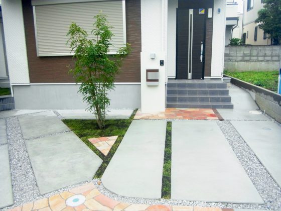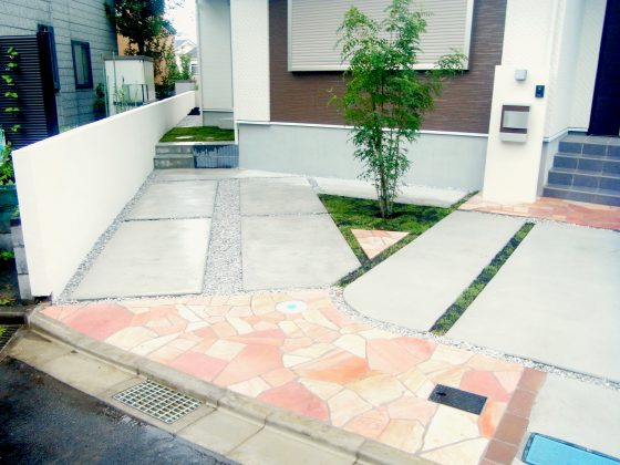 #塗り門塀#壁付ポスト #乱形石貼り#レンガライン#砂利ライン#化粧ブロック#階段 #植栽#天然芝#タマリュウ