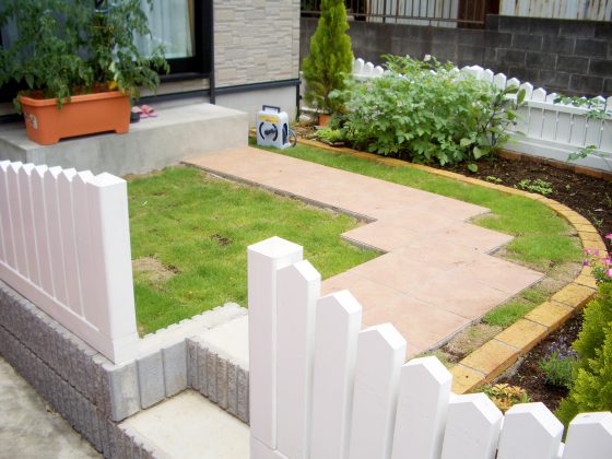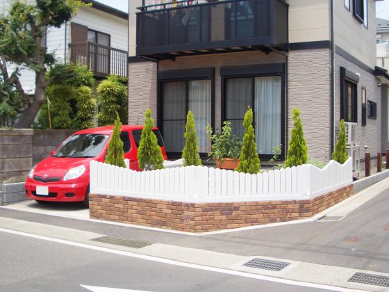 #セミクローズ#英国風 #化粧ブロック階段#300角タイル敷き #レンガライン#化粧ブロック#レンガ貼り塀#アメリカンフェンス#角柱 #車庫スペース#植栽#コニファー#天然芝