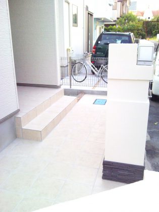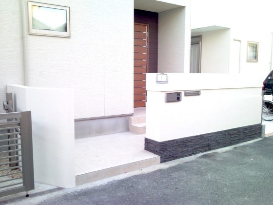 #凹門塀(塗り)#ボーダータイル貼り#口金ポスト#門灯#塗り塀 #300角タイル敷き#化粧砂利 #カーポート#オーバーゲート