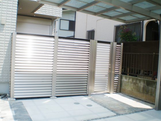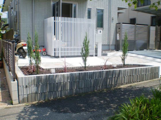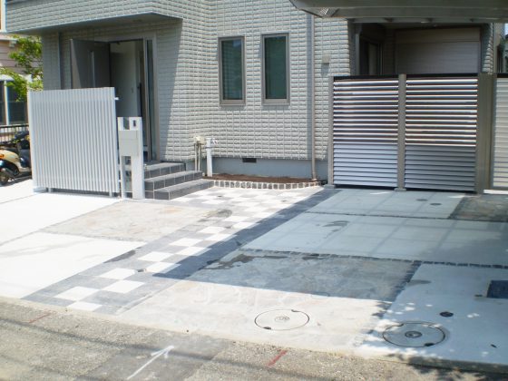 #機能門柱#乱形石貼り#300角タイル敷き(市松模様)#ピンコロライン #アルミ形材フェンス(アルミ色)#目隠しフェンス(縦格子・ルーバー)#アルミ形材門扉(アルミ色) #カーポート#化粧ブロック花壇#ピンコロ花壇#コニファー#コルジリネ