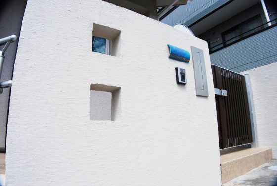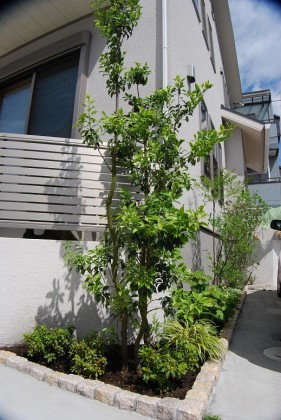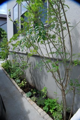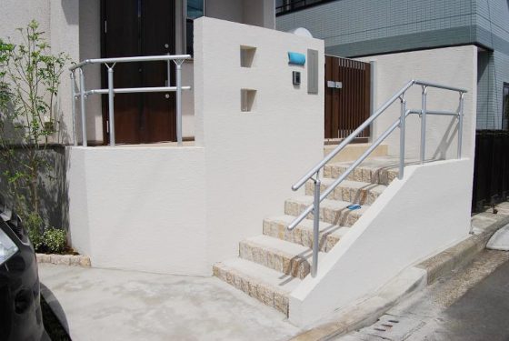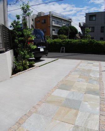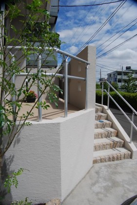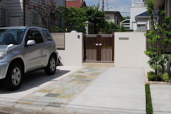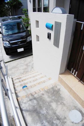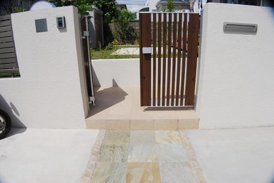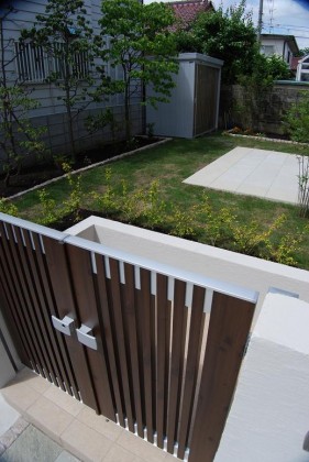 #塗り門塀#口金ポスト#ピンコロ階段#手すり #方形石貼り#タイル貼り#化粧砂利#ピンコロライン#タマリュウライン #塗装塀#スリット#アルミ形材フェンス(アルミ色)#目隠しフェンス(横スリット)#アルミ形材門扉(木調) #ピンコロ花壇#天然芝#シンボルツリー#人工木デッキ#ステップ#物置