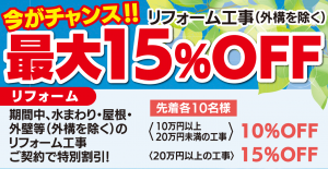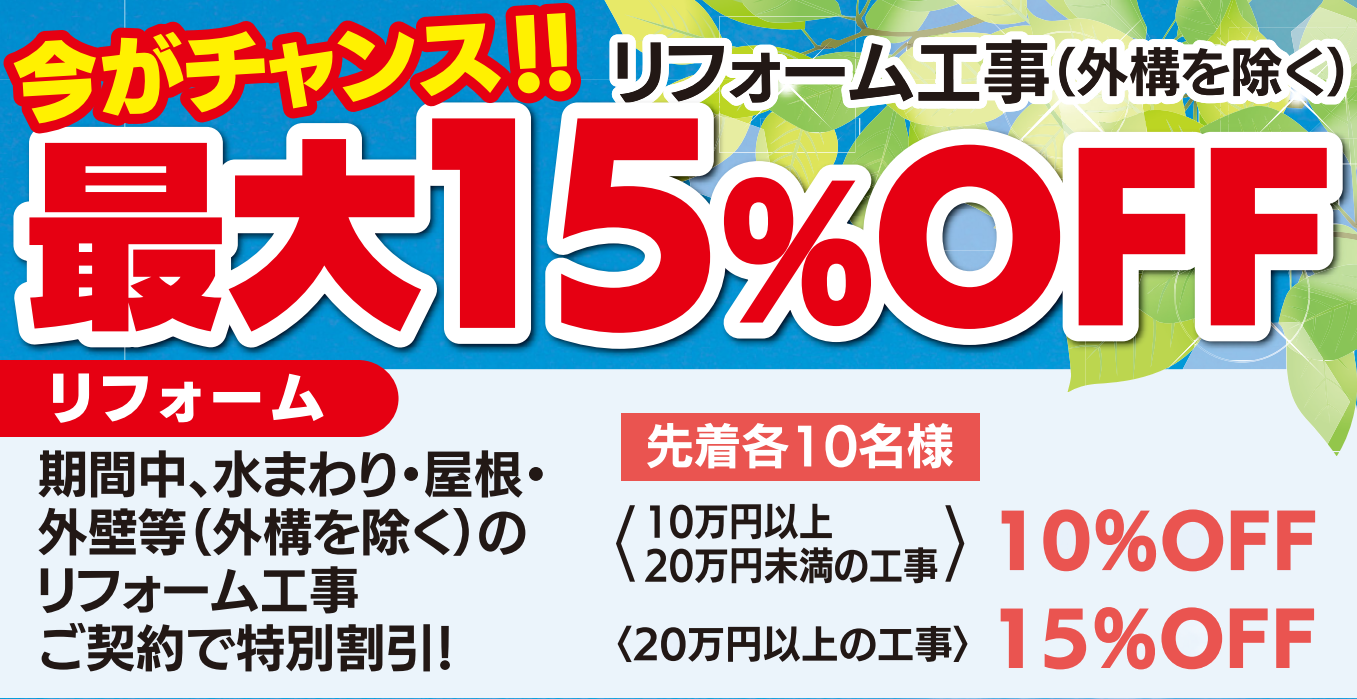 期間中、水まわり・屋根・外壁等(外構を除く)のリフォーム工事ご契約で