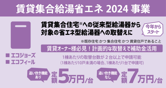 対象製品の基準等 事業内容の詳細は ≫賃貸集合給湯省エネ2024事業 事務局HP をご確認下さい |