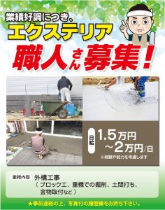エクステリア職人 ※外構工事(ブロック工/重機での掘削/土間打ち/金物取付け など)を行っていただきます |